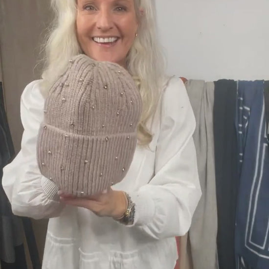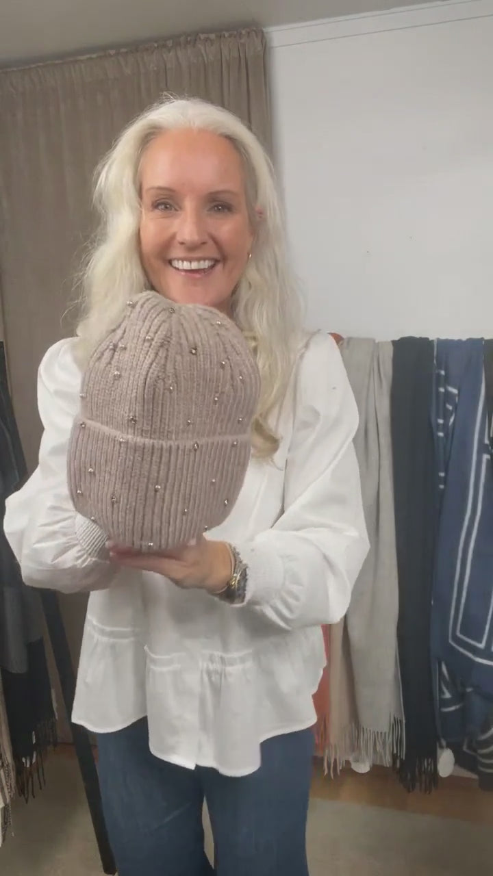 858205 Lue, Strikket lue med perlepynt - beige åpner en fullskjermvideo i det samme vinduet.