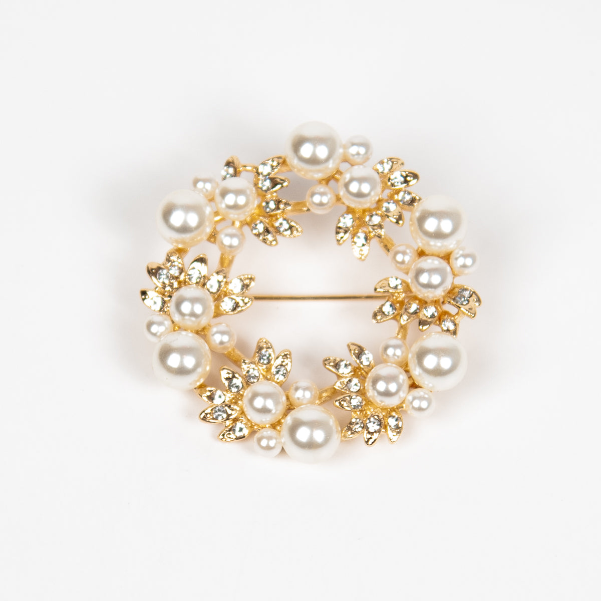 Denne dekorative brosjen i gullfarget metall har form av en elegant krans og er rikt utsmykket med perler og glitrende strass. Det varme metallet kombinert med perledetaljer og klare stener gir brosjen et luksuriøst og tidløst preg.